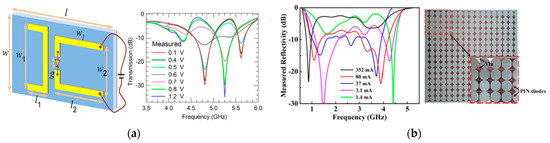 At the beginning of the twenty−first century, varactor diodes have been investigated to tune high−impedance surfaces for dynamic beam steering [23,24]. Later, a tunable metamaterial absorber was reported with varactor diodes and lumped resistors in 2007 [25]. The following works aim to achieve a large absorption rate and wide spectral tuning range, including electric−field coupled−LC (ELC) resonators [19], fishnet−like resonators [26], dual ELC resonators [27], spoof plasmonics [6], etc. In the last two years, varactor−controlled frequency selective surface (FSS) and electromagnetically induced transparency (EIT) structures have been reported with wideband frequency modulation [28,29], as shown in Figure 2a,b. The diodes are launched right on the effective coupling capacitor of the resonant structures. Several early reviews focus on active electromagnetic absorbers [30,31]. The readers may refer to them if they are interested. In addition to amplitude and frequency modulation, phase modulation of metasurfaces can be also achieved with varactor diodes [32].