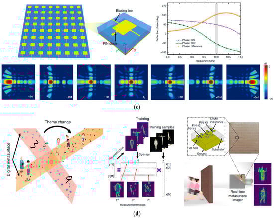 Currently, the PIN diode is also one of the most mature and stable technologies for RIS applications. Similar to varactor diodes, PIN diodes can be integrated into each metasurface pixel with subwavelength scales. Combined with the multi−layer−printed circuit board (PCB) power supply networks, each pixel can be coded individually and digitally in quantized phase states and programmed to constitute RIS with complex functions [28,33]. In 2018, L. Zhang et al. expanded the space−coded RIS configuration to space−time−coded RIS configuration with PIN diodes, which manipulate microwaves in both space and frequency domains [36]. Figure 3c illustrates the space−time−coded digital metasurface and its harmonic beam steering at optimized space−time coding sequences. In 2019, a reprogrammable metasurface imager was demonstrated by using multiple PIN diodes to produce phase differences [39], as shown in Figure 3d. Real−time imaging was obtained with machine−learning technologies. Later, PIN diode−based metasurface have been proposed to transmit digital information directly in 2021, which is a completely new architecture for wireless communications without using complicated digital–analog convertor and a series of active/passive microwave devices [40]. Frequency division/space division multiplexing wireless communication was demonstrated with PIN diodes by using digital coding to control the active phase states, realizing signal transmission at different access terminals at the same time with a transmission rate of 2.5 Mbps at 9.5 GHz [12]. The above−mentioned coding and programmable metasurfaces only achieve half−space modulation, i.e., reflection−type modulation. In 2021, full−space control of the programmable metasurface was reported by L. Bao and his colleagues, in which reflection and transmission share the same metasurface aperture [61]. The unit pixel of the full−space metasurfaces is controlled by using three PIN diodes with different bias sequences.