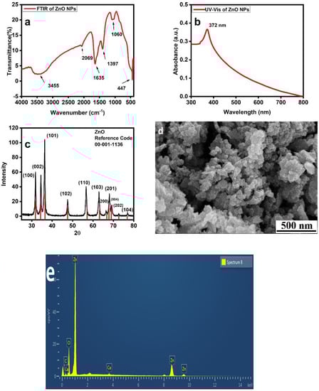 (a) FT-IR spectrum of ZnO NPs, (b) UV absorption spectrum of ZnO NPs, (c) XRD pattern of ZnO NPs, (d) HRSEM image of ZnO NPs, (e) EDX image of ZnO NPs.