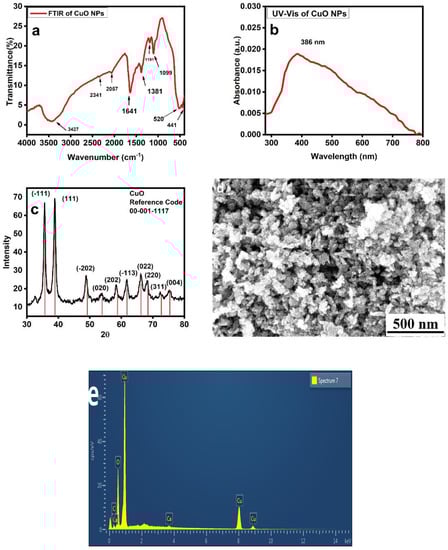Figure 2 shows various characterizations such as FT-IR spectroscopy, UV-Vis spectroscopy, X-ray Diffraction analysis (XRD), and scanning electron microscope images of CuO nanoparticles. Figure 2a shows the FT-IR spectrum of CuO NPs with different peaks in the range of 4000–400 cm−1. The band between 3615.3–3286.0 cm−1 was attributed to the stretching vibrations of the hydrogen-bonded O-H group [58]. The peak at 1627 cm−1 represented the stretching vibrations of C=O [64]. The presence of O-H with the formation of Cu-O bond was represented at 1382 cm−1 [60]. Peaks in the range of 522–1200 cm−1 were attributed to Cu bond formation in the presence of NaOH. Strong sharp peaks were seen at 694.4 cm−1 and 786 cm−1 that were attributed to CuO [60]. Cu-O stretching vibration was observed at 522 cm−1, which matched the stretching mode of vibration [60,64]. The UV-Vis spectra of the CuO NPs are shown in Figure 2b, with water absorption occurring at 386 nm. The metal oxide’s surface plasmon absorption resulted in the absorption at 386 nm in the spectrum. In metal oxide nanoparticles (NPs), surface plasmon absorption is linked to the collective oscillation of free conduction band electrons that are activated by electromagnetic radiation. When the wavelength of the incident light is bigger than the particle’s diameter, this form of resonance takes place. CuO NPs were formed, as shown by a surface plasmon absorption band with a peak at 386 nm [65]. Figure 2c shows the XRD spectrum of CuO nanoparticles. The diffraction patterns were analyzed from the standard diffraction files of CuO (Ref. Code 00-001-1117) giving the characteristic peaks at 2θ at about 35.65°, 38.9°, 48.9°, 53.9°, 58.35°, 61.7°, 66.2°, 68.1°, 72.15°, and 75.35°, corresponding to the (−111), (111), (−202), (020), (202), (−113), (022), (220), (311), and (004) Miller indices, respectively, that match the standard values with the D-spacing value of 3.84 A0 and density of crystallite 6.10 gcm−3 [62].