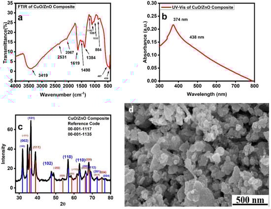 Figure 3 shows various characterizations such as FT-IR spectroscopy, UV-Vis spectroscopy, X-Ray diffraction analysis (XRD), and scanning electron microscope images of CuO NPs. Figure 3a represents the FT-IR spectrum of ZnO/CuO obtained by IR spectrophotometer in terms of % transmittance. The broad band at 3652.8–3170.9 cm−1 represents the O-H bond [58]. The peak at 1645.19 cm−1 is attributed to stretching vibrations of C=O [64]. The peak at 1500.47 cm−1 is attributed to bending vibrations of the H2O molecule [66]. Peaks in the range of 1000–1200 cm−1 are attributed to M-O bond formation in the presence of NaOH [60]. The stretching mode of the Zn-O bond is given at 495 cm−1. Zn-O stretching vibrations are shifted to 495 cm−1 from 485 cm−1 with the addition of Cu-O Peak at 485 cm−1, which is attributed to the stretching mode by the combination of Zn-O and Cu-O [66]. Synthesized ZnO/CuO NPs were subjected to UV–Visible spectrophotometer analysis which confirmed the formation of particles in the initial stage. The solid greyish, black-colored samples of ZnO/CuO nanocomposite synthesized using Corriandrum sativum were subjected to a scan UV-Spectrophotometer in the range of 200–1000 nm. Figure 3b shows the UV–Vis spectra of the as-synthesized ZnO/CuO nanocomposite dispersed in water exhibiting the maximum absorption peaks at about 374 nm and 438 nm, respectively. In the spectrum, the peaks at 374 nm and 438 nm confirmed the formation of nanocomposite [3]. The diffraction patterns were analyzed from the standard diffraction files of ZnO (Ref. Code 00-001-1136) and CuO (Ref. Code 00-001-1117). The characteristic peak at 2θ at about 31.85°, 34.6°, 35.8°, 36.4°, 38.85°, 47.6°, 48.75°, 53.8°, 56.75°, 58.35°, 61.85°, 63.05°, 66.7°, 68.45°, 69°.15, 72.75°, 72.7°, 75.25°, 76.8°, and 79.95° correspond to the (100), (002), (−111), (101), (111), (102), (−202), (020), (110), (202), (−113), (110), (022), (200), (220), (112), (201), (311), (004), and (004) Miller indices, respectively, that match to the standard values.