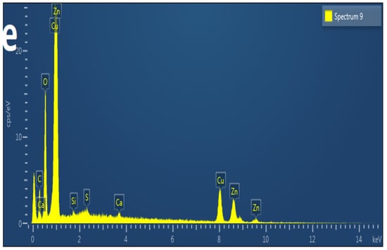Figure 3d illustrates the morphology and size of the ZnO/CuO nanocomposite that was analyzed at high magnification (500 nm). Elongated and irregularly shaped small particles are seen on the surface with smooth unclear boundaries. At some points, nanocomposites are seen to agglomerate and form chunks and cavities. In the case of the nanocomposite, the average crystallite size calculated from the XRD pattern using the Sherrer equation was 11.3 nm, and it was found to be 11 nm from SEM using image j software. The results of Energy Dispersive X-ray Spectroscopy are given in (Figure 3e), which show the presence of Zn, Cu, O, C, Si, S, and C constituents with weight percentages of 36.87, 27.65, 21.32, 12.92, 0.34, 0.34, and 0.56%, respectively. By the presence of Zn, Cu, and O, the formation of ZnO/CuO nanocomposite could be predicted. The sample is synthesized from the green method by using plant extracts, so the presence of C could be justified. A minute amount of calcium, sulfur, and silicon is also present. Calcium and sulfur come from leaf extracts, while silicon is due to calcination holder.