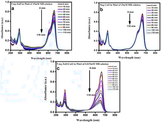 Barzegar et al. reported methylene blue (MB) dye degradation photo catalytically by CdS nanoparticles when exposed to UV light [67]. In the present study, the comparative photocatalytic activity of ZnO, CuO, and ZnO/CuO was done using MB dye. The photo decolorization of the MB dye, when exposed to sunlight, served as a measurement of the dye’s degradation. The absorbance spectra for the photocatalysts ZnO, CuO, and ZnO/CuO at a concentration of 5 mg are shown in Figure 4a–c, respectively. The photo-decolorization process makes it abundantly evident that the absorbance gradually lowers with rising exposure duration. It is also observed that the photocatalytic activity of the ZnO/CuO catalyst is higher as compared to CuO and ZnO NPs. In addition, the close intercalation of CuO and ZnO NPs in the ZnO/CuO nanocomposite should be essential in boosting photo reactivity [68]. ZnO/CuO NPs are generally tightly packed, which speeds up electron flow between the surfaces and prevents photogenerated electrons and holes from recombining. Superoxide radical anions, photogenerated holes, and hydroxyl radicals all play active roles in the photocatalytic degradation of MB dye solution [31,68]. According to findings from the literature, OH and holes play a significant role in the photocatalytic destruction of organic pollutants by ZnO and CuO, and ZnO/CuO NPs under UV light.