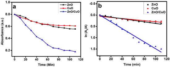 (a) Variation of absorbance measured at 341 nm with sunlight exposure time, (b) the linear fitting for the absorbance spectra of MB dye solution containing 5 mg of ZnO, CuO, and ZnO/CuO nanocomposite.