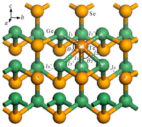 Figure 1 gives the doped model of GeSe_Te. One of the Se atoms in GeSe is chosen to be substituted by Te. There are five Te-Ge bonds, l1, l2, l1′,l2′ and l3, denoted by white dotted arrows around the doping Te atom. The geometric structure of these five bonds seem to be the same as that of GeSe_Rh, the substitutional doped GeSe monolayer with a Rh atom [26]. The doped atoms in GeSe_Rh and GeSe_Te are quite different. The former is a Ge atom, while the latter in this work is a Se atom. However, intriguringly, the bond structures are almost the same. Among these bonds, l2 and l2′ are two newly generated bonds after the substitution. The gray dotted arrows of l0 and l0′ denote the two Ge-Se bonds existing in the pure GeSe monolayer. After doping, l0 and l0′ disappear in GeSe_Te. This may be attributed to the enhanced interaction between the Te atom and its neighboring Ge atoms. Thus, l0 and l0′ are broken by the stronger interaction. The bond angle of θ1 is the in-plane angle between l1 and l2′, while θ2 is the out-of-plane bond angle of l2 and l3.
