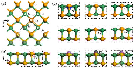 (a,b) Top and side view of GeSe monolayer doped by a Te atom. (c) A part of the side view of each doped GeSe model by one of group IV–VI atoms.