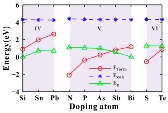 where n = nGe + nSe + ndope is the total number of atoms in the doped system. There are 36 atoms in our doped GeSe model. One of the Se atoms is substituted by a group IV–VI atom. That is, we can obtain n = 36, nGe = 18, nSe = 17, and ndope = 1. According to Equations (1) and (2), the formation energy, cohesive energy and bandgap are calculated and these are shown in Figure 3.