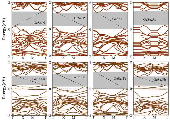 Electronic band structure of the doped model (GeSe_N, GeSe_P, GeSe_S, GeSe_As, GeSe_Sn, GeSe_Sb, GeSe_Te, and GeSe_Pb) for the most stable structures. The shaded region indicates the bandgap, and the dashed lines indicate the bandgap type.