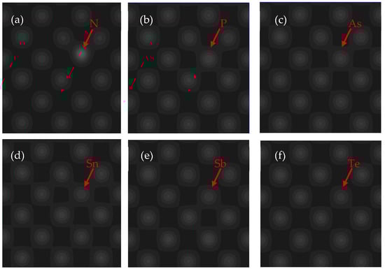 To further understand the variations in the local geometry of the doped GeSe model, the charge density difference is calculated and shown in Figure 5. These figures are listed with an increase in the atom size. The red arrow and symbol are used to label the position of the doping atom in each figure. With different doping atoms, the optical spectra of the charge density difference are much different around the doping atoms. This is attributed to the local deformations induced by the presence of the doping atoms. The contour of the charge density difference of the doping atom depends on the bond lengths. The doping N atom is near the top left/right Ge atom. We could deduce that there are two bonds between the doping N atom and the top left and top right Ge atoms. These two bonds are the shortest of all. Meanwhile, no bond exists between the N atom and its bottom left/right Ge atom (l1 and l1’), owing to the long distance. These deductions are in accord with the parameters of the bond lengths in Figure 2a and Table 1. As the size of the doping atom increases in Figure 5b–f, the doping atom moves gradually away from the top left/right Ge atom and towards the bottom left/right Ge atom. In Figure 5d,f, new bonds between the doping atom and its bottom left/right Ge atom (l2 and l2’) arise by doping the Sn and Te atoms. Sn is the main element of group IVA, which has two valence states, positive bivalent and positive quadrivalent. Te has the same outermost electron number with the substituted Se atom and exhibits positive bivalent. Moreover, the atom sizes of Sn and Te are both large. Combing the valence states of positive bivalent and large atom size, the doping Sn and Te atoms generate four bonds with the neighboring four Ge atoms.