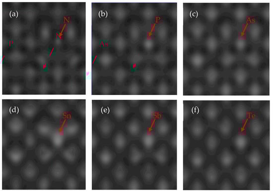 Some valuable differences among the scanning tunneling microscope (STM) images are found to promote future experiments; for instance, identifying the doping states. Under a positive bias of 2.0 V, the STM images in Figure 6 are simulated by the Tersoff-Hamann approximation, to better identify and to study the effects of the substantial doped GeSe monolayers. In Figure 6a, the atom N is a little darker and smaller than the Ge and Se atoms. The distance between the doping atom N and its neighbor atom Ge is the shortest, which is in accordance with the smallest radius of N and their shortest bond length in Table 1. The P, Sb, and Te atoms appear as white spots (shown in Figure 6b,e,f). The As atom tends to disguise as a Se atom. The difference between the As atom and the Se atom is very subtle (shown in Figure 6c). This may be attributed to their similar atom size. In the GeSe_Sn model (shown in Figure 6d), the brighter Sn and its two neighboring Ge atoms make up a “kidney”. Though GeSe_Sn and GeSe_Te (shown in Figure 6f) possess almost the same geometric parameters, there is a striking contrast between their STM images. The STM images of GeSe_Sb (shown in Figure 6e) and GeSe_Te are similar to each other. However, the Sb atom is slightly brighter than the Te atom. That is because the Sb atom is not only higer than the initial Se atom in GeSe_Sb, but it is also higher than other doping atoms, according to Figure 2. Despite the location of the Te atom in Figure 6f is almost the same as that of the initial Se atom, the Te atom seems brighter owing to a larger radius of Te than those of Ge and Se. The crystal structures of doped systems with the atoms of N and Sn are easy to be identified through their STM images, while others are difficult.