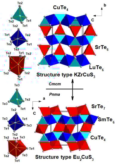 Thus, the three-dimensional crystal structure of SrLnCuTe3 (Ln = Sm, Gd and Tb) and SrLnCuTe3 (Ln = Dy–Tm and Lu) is resulting from two-dimensional layers formed by octahedra and tetrahedra in the ac and bc planes, accordingly, these layers are separated by naked dimer ribbons or by alternating polymeric chains formed in turn by monocapped trigonal prisms and naked trigonal prisms, respectively (Figure 1).