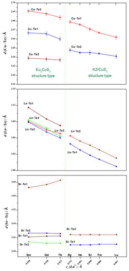 In the SrLnCuTe3 (Ln = Sm, Gd and Tb) structures of the structure type Eu2CuS3, the coordination polyhedron six distances of d(Sr—Te) are shorter than 3.39 Å, and the seventh distance d(Sr—Te) gradually increases: 3.650(2) Å (SrSmCuTe3) → 3.667(2) Å (SrGdCuTe3) → 3.692 Å (SrTbCuTe3) (Table S1, Figure 2). A similar trend was observed for the isostructural compounds EuLnCuS3 [46] and SrLnCuS3 [30,40]. In the structures for SrLnCuTe3 (Ln = Dy–Tm and Lu) of the structure type KZrCuS3, the cations Sr2+ have six distances d(Sr—Te), being shorter than 3.38 Å and two additional anions Te2− (2 × 3.905(2) Å (SrDyCuTe3), 2 × 3.8843(9) Å (SrHoCuTe3), 2 × 3.866(2) Å (SrErCuTe3), 2 × 3.8550(8) Å (SrTmCuTe3), 2 × 3.830(2) Å (SrLuCuTe3). The seventh and the eighth telluride anion are not included in the coordination of Sr2+ due to the very weak interactions.