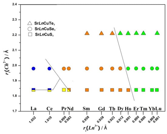 All currently known compounds of formula SrLnCuCh3 with Ch = S [30,33,39], Se [33,35] and Te [this work] are shown in Figure 3. There, the ionic radii of the divalent anions (Ch2–) are plotted against the ionic radii of the cations of the trivalent lanthanoid cations (Ln3+). The lines represent virtual boundaries between each type of structure and have been arbitrarily added to the diagram to provide a visual breakline between modifications. The chalcogenides SrLnCuCh3 are isostructural. When transiting from sulfur to tellurium, the anion sublattice expands (r(S2–) = 1.84 Å, r(Se2–) = 1.98 Å, r(Te2–) = 2.21 Å [47]). The change of the structure type from Eu2CuS3 to KZrCuS3 in sulfides occurs at the Y/Er boundary [39,45]; in selenides, it is found at the Dy/Ho boundary [33,41]; and in tellurides, it meets the Tb/Dy boundary (Figure 3). Thus, the larger the chalcogenide radius, the earlier the change of the structure type and the space group from Pnma to Cmcm in the SrLnCuCh3 series of quaternary chalcogenides takes place.