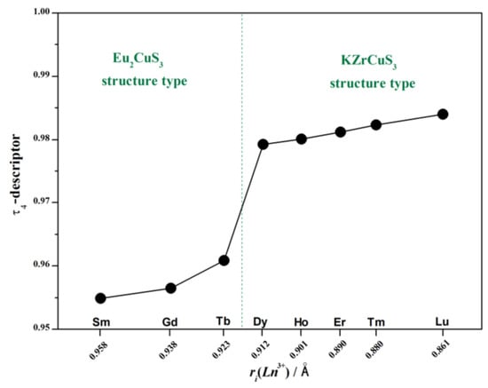 The tetracoordinated environment can also be characterized using the τ4-descriptor [50]. The values of τ4 are the following: for ideal tetrahedral structures it is 1.00, for trigonal-pyramidal structures 0.85, for seesaw structures 0.64–0.07 and for perfect square planar structures 0.00. The τ4 values of the tellurides SrLnCuTe3 (Ln = Sm, Gd–Tm and Lu) of both structure types range from 0.955 to 0.984 (Table 4 and Figure 4), indicating that the coordination geometry around Cu+ is distorted by 10–30% from an ideal tetrahedron to a trigonal pyramidal structure. A greater distortion of tetrahedra is observed in compounds crystallizing in space group Pnma (τ4 varies from 0.955 to 0.961) than in Cmcm (τ4 varies from 0.979 to 0.996) (Figure 4). A jump in the τ4-descriptor occurs at the boundary of the change of structure types. As ri(Ln3+) decreases, a decrease in the distortion of the tetrahedron is observed.