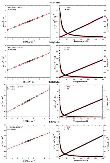 Field-dependent magnetic moment at 300 K (left), temperature-dependent specific magnetization and reciprocal magnetic susceptibility at 500 kOe (right) of SrLnCuTe3 samples with Ln = Tb–Er. The measurements of low-temperature magnetization were performed in the zero-field cooled (ZFC) and nonzero-field cooled (FC) modes.