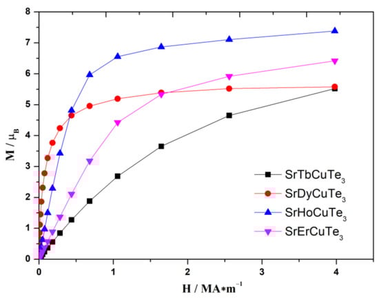 Magnetic field dependencies at 2 K calculated with reference to one formula unit are shown in Figure 6. Their view is characteristic of a ferromagnet slightly above the Curie temperature, where saturation is not reached up to very strong fields. Theoretically, the saturated magnetization for Tb3+ and Er3+ cations is 9 μB, and for Dy3+ and Ho3+ 10 μB.