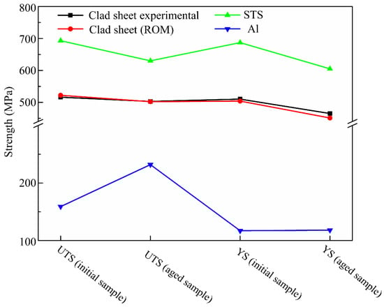 - In contrast, the aged sample has a lower yield ratio than that of the initial clad composite. The UTS and YS values of the composites are consistent with the computed values from the ROM. The interfacial bonding strength of the initial sample is 70 MPa, while that of the aged sample is 130 MPa.