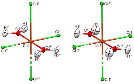 The local coordination environment at Cu is shown in Figure 1. CuCl2∙2H2O, 1, crystallizes in Pmna with the trans-disposed water molecules and the copper along a two-fold axis through the centre of the unit cell, and parallel to the a axis and the Cu, and four Cl ions on the mirror plane perpendicular to a. The primary structural data (Table 1) are in agreement with earlier X-ray [32,33,34,35] and neutron [36] diffraction data. The trans-disposed Cu–Cl1 and Cu–Cl1 vi bonds are short, 2.2870(3) Å, and along with the two water ligands form an orthogonal square planar geometry that is site-symmetry controlled. The longer, also trans-disposed Cu–Cl1 ii and Cu–Cl1 v bonds are at 2.9023(3) Å and are slightly offset from perpendicular, such that the Cl1–Cu1–Cl1 v angle is 91.10(1)°. The short–long pattern in bonds to Cl is expected for a “pseudo-Jahn-Teller” elongated d9 electron configuration at Cu(II) [37]. The Cu1–O1 distance is 1.9420(9) Å for the coordinated aqua ligand, in excellent agreement with 1.94 Å for bonds to equatorial water oxygen atoms found by Ohtaki in aqueous Cu(II) ions from X-ray scattering probability distribution curves [38]. The axial halides belong to CuCl2(OH2)2 moieties from the layers above and below the depicted molecule through perpendicular secondary bonding (see also Figure 2).
