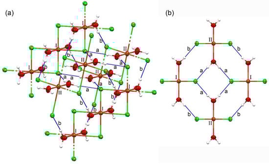 In the lattice structure of 1 (Figure 2), the layers of CuCl2(OH2)2 contain chains linked via bridging axial contacts; parts of two such chains are shown (the three left-side and three right--side Cu atoms labeled I in Figure 2a; in projection, these are the left and right I in Figure 2b). This layer is linked by Cl∙∙∙OH H-bonds to the next layers on either side (two pairs of bridged Cu atoms in these layers are labelled II in Figure 2a; in projection, the upper and lower II in Figure 2b). The “square planar” CuO2Cl2 moieties, involving the shorter Cu–Cl bonds in the type I and type II chains, are rotated by 77.9° from each other. The primary H-bonding contacts, ( chains in Etter notation [39], labelled b in the figure) always involve a type I chloro ligand acceptor and a type II water O–H donor. Larger rings are defined by four such H-bonds linking two type I and two type II centres (labelled a in the figure). For alternative representations of the lattice structure of 1, see [10].
