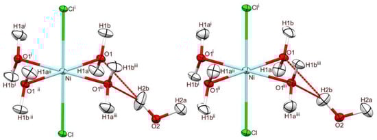 The local coordination environment at Ni is shown in Figure 4. NiCl2∙6H2O, 3, crystallizes in I2/m with Z′ = 0.25, a mirror bisecting the NiCl2 and O(2)H2 non-coordinated water as well as symmetry at the Ni. The trans-disposed Cu–Cl and Cu–Cl i bonds are relatively short at 2.3949(3) Å (Table 3), and along with the four symmetry-equivalent water ligands O(1)H2 form a square planar coordination environment to give an overall close-to-ideal tetragonal coordination at this d8 Ni2+, affording a salt hydrate which is known to be paramagnetic [15,16]. The Ni–O distances are slightly longer than the 2.04 Å measured by Ohtaki from X-ray scattering experiments on aqueous solutions of Ni(II) ions [38]. The geometry of the Mo Kα structure determination is more precise than that obtained with copper.