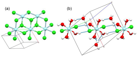 In the structure of anhydrous NiCl2, 4 (Figure 6a), each Ni atom is octahedrally coordinated by chloro ligands, but the latter each have three short bonds to Ni. These also interact with Cl atoms on neighbouring layers via contacts that exceed the sum of the v.d.W. radii by 0.18 Å [44]. In the hydrate (Figure 6b), all but two of the Ni–Cl bonds are replaced by thermodynamically stronger Ni–O bonds, and all the lattice-binding interactions are formed by the network of O–H∙∙∙O and O–H∙∙∙Cl hydrogen bonds (Table 2), producing a robust 3D lattice, in place of the layer structure, that is also much more elastic. These structural changes are relevant to use in proposed thermal energy storage systems [7,8].