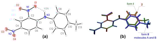 (a): General view of the molecule 1 in crystal form I, anisotropic displacement parameters are drawn at 50% probability level; (b): overlay of molecules from crystal structures of forms I (green), II (light and dark blue) and crystal structure of 2,4-dinitrodiphenylamine 2 [], red).