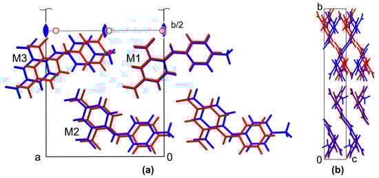It turns out that both of the structures contain the same packing fragment, a stack along the crystallographic c axis in form I (or along the a direction in 2) formed by molecules M1 in Figure 3a. These fragments fit perfectly, with an RMS deviation of the common atoms of only 0.062 Å. In the next stack M2, which is related to M1 by a two-fold screw axis, the molecules of form 2 are slightly shifted, and in the stack M3, which is related to M1 by a translation, the shift relative to form I reaches the above-mentioned difference of ca. 1.2 Å of the corresponding unit cell parameter. The latter shift is approximately equal to the linear size difference of the H and Me substituents. Thus, taking into account the difference in the size of the substituents, we can consider the fragment depicted in Figure 3a as quasi-isostructural ones. On the other hand, these fragments are related to each other in the whole unit cell by a proper two-fold rotation axis in form I, but by an inversion center in form 2, which leads to the observed difference in crystal symmetry (Figure 3b). It should be noted that partial isotructurality is a known phenomenon, and the structures of 1 and 2 are a perfect illustration to its relationship with polymorphism [].