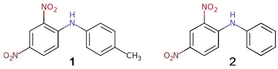 In this paper, we report two polymorphic forms of the title compound, 4′-methyl-2,4-dinitrodiphenylamine 1 (Scheme 1). This molecule contains both the formally electron donor and electron acceptor fragments, which assumes the possibility of intramolecular charge transfer in the π-conjugated system. Although compound 1 has been known of for many years and was tested for a potential application as antibacterial agent [] and for non-linear optical properties [], its crystal structure is not yet reported. However, as the powder sample of compound 1 is known to exhibit second-harmonic generation [,], it has been expected to be non-centrosymmetric. Recently, a crystal structure of the closely related phenyl-substituted compound 2,4-dinitrodiphenylamine (2) was reported [], and while it has the same color and morphology as a bulk sample of  compound 1, it crystallizes in the centrosymmetric space group P21/n. It turns out that compound 1 crystallizes at least in two polymorphic forms, which were established by single-crystal X-ray diffraction analysis. The supramolecular synthons in the polymorphs were thoroughly studied using DFT calculations and a topological analysis of the theoretical electron density distribution.