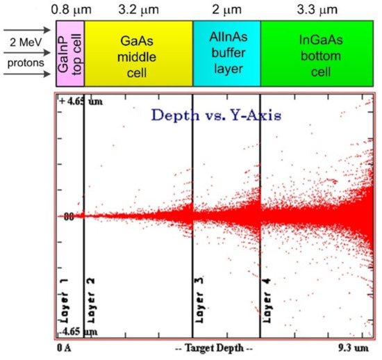 Proton irradiation was performed using a 2 × 1.7 MV tandem accelerator at Peking University. To ensure uniform irradiation of samples, the proton beam is scanned in the vertical (Y) and horizontal (X) directions by the scanner before hitting the sample. The proton irradiation experiment was carried out at room temperature. The proton energy is 2 MeV in this experiment to ensure that the proton can completely pass through the IMM3J solar cells. The proton fluence is 2 × 1011, 8 × 1011, and 2 × 1012 cm−2 in this experiment, which mainly refers to our previous proton irradiation experiments on lattice-matched solar cells [20] and other related references [9]. The flux used in the experiment is 2 × 109 cm−2 s−1, which can ensure that the irradiation time is not too long or too short and that it cannot result in an increase in sample temperature due to irradiation. Figure 1 shows the track distribution of 2 MeV protons in IMM3J solar cells obtained by SRIM simulation [21]. Protons with an energy of 2 MeV can pass through the IMM3J solar cell and cause damage to all subcells.