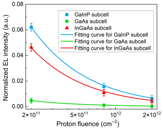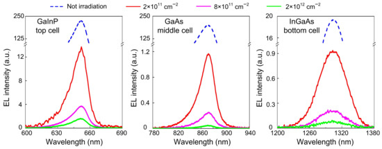 Under proton irradiation, the relationship between the degradation of the open circuit voltage of each junction cell and the intensity of the EL spectrum can be derived by the optoelectronic reciprocity relation [27,28].