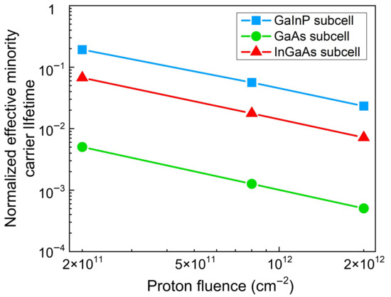 where is the nonradiative recombination lifetime before irradiation. is calculated by (D is the diffusion coefficient, and is the diffusion length before irradiation). D is equal to 60, 200, and 188 cm2 s−1 for the GaInP, GaAs, and InGaAs subcells of the IMM3J solar cell, respectively [16,24]. is equal to 5.21 × 10−3 cm, 7.94 × 10−3 cm, and 3.63 × 10−4 cm for the GaInP, GaAs, and InGaAs suncells of the IMM3J solar cell, respectively. Therefore, the of the GaInp, GaAs, and InGaAs subcells can be calculated to be equal to 4.52 × 10−7 s, 3.15 × 10−7 s, and 7.01 × 10−10 s, respectively. Thus far, the effective minority carrier lifetime can be calculated by Equation (4) and listed in Table 2. The minority carrier lifetimes of the GaInP, GaAs, and InGaAs subcells are 6.99 × 10−9 s, 3.09 × 10−8 s, and 2.31 × 10−8 s, respectively, before proton irradiation, such values being of the same order of magnitude as those in the Refs. [16,24,25].