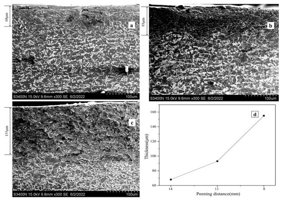 Figure 4 shows the cross-sectional SEM microstructure of the samples after USP treatment with different distances, and the thickness statistics of the deformed layer are shown in Figure 4d. The thickness of the deformed layer increased gradually as the distance decreased. As the USP distance decreased from 11 mm to 8 mm, the thickness of the deformed layer drastically increased from 93 μm to 155 μm, which indicated that the USP distance had an evident impact on the deformed layer thickness. The smaller the USP distance was, the more times the steel ball hit the sample, the smaller the shot gravity, and the lower the energy loss, resulting in higher energy acting on the sample.