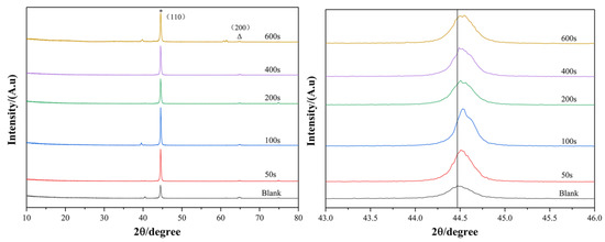 Figure 6 shows the XRD patterns of the samples after USP treatment for different lengths of time. With the increase in the USP time and the progress of plastic deformation, the number of dislocations in the crystal increased and more slip occurred, which inevitably caused the mutual delivery of dislocation and greatly improved the strength of the metal materials. The untreated sample was a typical rolled steel which had preferential orientation (110). After the USP treatment, the phase structure did not change, but the diffraction peaks of the USPed samples shifted to higher angles. The change in the peak value after the USP treatment indicated that severe plastic deformation led to grain refinement. This was caused by the residual stress induced on the surface of the samples during the USP process [26]. At the same time, the diffraction peaks of the USPed sample broadened. This is according to the Bragg’s law equation shown in Equation (1), where d is the interplanar spacing of the crystal, θ is the Bragg angle, n is a positive integer and λ is the wavelength of the incident wave.