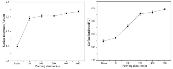 Figure 7 shows the surface roughness and microhardness of the samples USPed for different lengths of time. The surface roughness and microhardness of the samples increased significantly with the increase in USP time. Before the USP, the surface of the sample was polished with 80# sandpaper, and the surface roughness of the un-USPed sample was 0.994 μm. After 50 s of USP treatment, some pits were left on the surface, and the roughness increased sharply. As the USP time increased, the pits on the surface were further deepened, and the roughness increased. At the same time, the microhardness of the USPed samples increased. As the USP treatment time increased, the impact of steel balls on the surface of the samples increased, resulting in remarkable working hardening and microhardness increases. When the USP time reached 200 s, the increment in the hardness value became stable. When the USP treatment time continued to increase, the grains of the sample were further refined, and the plastic deformation of the sample surface gradually tended to be saturated, resulting in the hardness value tending to be flat.