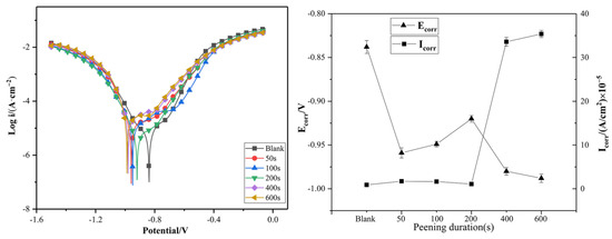 Electrochemical tests and surface immersion studies need to be linked [32]. Electrochemistry is a form of theoretical data processing, and surface morphology characterization represents the actual corrosion situation; the two are closely linked. Figure 10 shows the electrochemical test polarization curves and a line plot of the corrosion potential and the corrosion current of samples with different lengths of USP times. The values of the fitting parameters derived from the polarization curves of the steel are summarized in Table 5. During the first 100 s, the corrosion current density of the samples increased, and the corrosion potential of the sample shifted in the negative direction. When the USP time increased to 200 s, the corrosion current density decreased, and the corrosion potential of the samples shifted in the positive direction. This was possibly because the USP time was relatively short, the hardening layer of the sample was shallow and the hardness had not improved enough. When the USP time increased to 200 s, the hardened layer reached the appropriate thickness, and the grain was finer. However, after 400 s of USP treatment, an interesting phenomenon appeared. The corrosion current density of the samples increased again, while the corrosion potential of the samples decreased. This may have been due the USP treatment being too long, which caused more cracks, and stress appeared on the surface of the specimens.