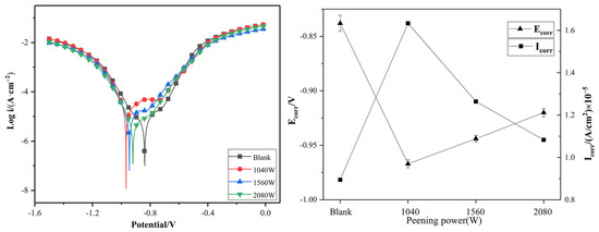 Figure 12. Electrochemical test polarization curves and line plot of the corrosion potential and corrosion current of samples with different levels of USP power.