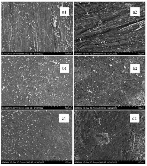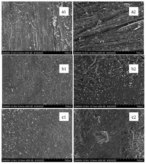 Figure 11. SEM macro-morphology characteristics of Q345B steel in 3.5 wt.% NaCl solution for 3 days: (a1) un-USPed; (b1) 200 s-2080 W-11 mm; (c1) 600 s-2080 W-11 mm; for 7 days: (a2) un-USPed; (b2) 200 s-2080 W-11 mm; (c2) 600 s-2080 W-11 mm.