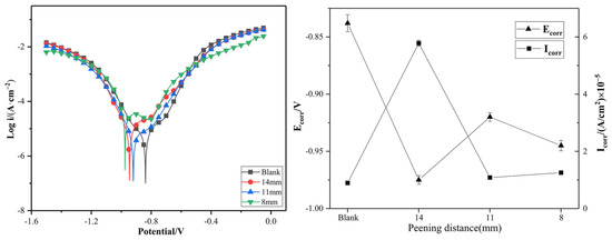 Figure 14 shows the electrochemical test polarization curves and a line plot of the corrosion potential and corrosion current of samples with different USP distances. The values of the fitting parameters derived from the polarization curves of the steel are summarized in Table 7. As the USP distance decreased, the electrochemical corrosion current density of the samples decreased first and then increased. Meanwhile, the corrosion potential of the samples increased first and then decreased correspondingly. A longer USP distance resulted in lower peening energy acting on the surface of the samples, and better surface quality was obtained. When the USP distance was reduced to 8 mm, the excessive energy led to cracks on the surface.