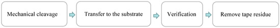 The h-BN flakes were prepared by mechanical cleavage of boron nitride powder (Momentive, PT110) [25]. Boron nitride powder of grade PT110 is a large single-crystal powder in the typical hexagonal platelet (graphite-like) shape. PT110 possesses an average particle size of ~45 μm. The h-BN flakes used in our study were peeled off with adhesive tape, attached to a 90 nm thick SiO2 substrate and identified by using simple optical microscopy. The sample preparation process is shown in Figure 1. First, sprinkle boron nitride powder on a tape, and then, repeatedly use the new tape to stick to the previous tape 20 times. Then, stick the last tape to the SiO2 substrate, press it hard with an eraser and finally tear the tape off. Some of h-BN flakes were found to be transferred to the substrate by means of optical imaging. The thickness of the flakes prepared was measured by an atomic force microscope. Due to the residual glue during the transfer process, the substrate was heated at 300 °C to remove the glue on the hot plate.