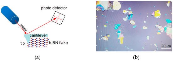 The thickness and morphology of the h-BN flakes used in our study were identified by AFM (Park, XE-70) with closed-loop piezo stages in the tapping mode, which was housed inside an environmental chamber with a computerized humidity control. AFM is an advanced tool used to characterize sample surfaces with outstanding resolution. It eschews optical methods of microscopy in favor of a scanning probe, which comprises an extremely sharp probe tip mounted on a cantilever, as shown in Figure 3a. In tapping mode, the sharp probe tip is not scanned across the sample surface while in constant contact. Instead, the cantilever is vibrated near its resonance frequency, causing the tip to oscillate up and down. This means the probe only comes into close contact with the surface intermittently, so the surface cannot be damaged by the tip during the scanning process. Silicon nitride AFM cantilevers (AC40TS, Olympus, Tokyo, Japan) with a spring constant of 0.1 N/m and tip of curvature about 8 nm were employed in every measurement. The areas of interest were obtained and marked through an optical microscope of AFM, as shown in Figure 3b, so that they can be located more quickly by the tip of AFM. The h-BN flakes were scanned after the annealing process was done for 24 h. The resonant frequency of the cantilever was 110 kHz, and the scan frequency was set at 1 Hz.