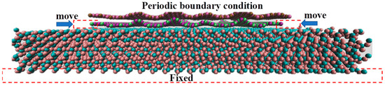 The LAMMPS package was used to study the crack effect of h-BN flakes under compressive stress. The simulation model consists of crystalline silicon dioxide and bilayer h-BN flakes, in which silicon dioxide is composed of 11,657 atoms and the bilayer h-BN flakes are composed of 2880 atoms, as shown in Figure 4. A rectangular crack appears in the h-BN flake after deletion of the 10 Å× 20 Å atoms at the edge. As mentioned above, the compressive stress is caused by the thermal expansion coefficient mismatch between the h-BN flake and the substrate during the cooling process. Therefore, in order to simulate compressice stress, both sides of the bottom layer of the h-BN flake move toward the center region. The Tersoff potential is used to describe the atomic reaction in the silicon dioxide and h-BN flake layers, and the parameters are detailed in Reference [27]. The interaction of the h-BN flake inter layers uses the ilp/graphene/hbn and coul/shield potential, and the interaction between the h-BN flake and silicon dioxide layer uses van der Waals force, and the parameters are detailed in Reference [28]. The force at the bottom layer of the silicon dioxide substrate is set at zero to prevent the model from moving during the simulation. The system first relaxes for 20,000 steps under the NVT ensemble, and then, the atoms of the bottom layer on both sides move 1000 steps toward the center at a speed of 2 Å/ps, then continue to run 50,000 steps. The temperature is kept at 1 K through the Nose–Hoover thermostat, the time step is set to 0.001 ps and the total simulation time is 71 ps.