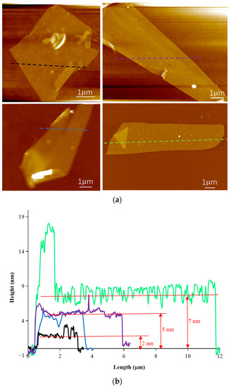 (a) AFM morphology of h-BN flakes with different thicknesses. (b) Height of h-BN flakes corresponding to the different colored dashed lines in Figure 5a.