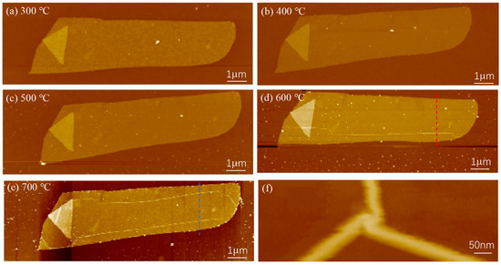 The h-BN flake of 7nm thickness was chosen to observe the morphology variations after each annealing of different temperatures. Figure 6a–e show AFM images of h-BN flakes after annealing of 300 °C, 400 °C, 500 °C, 600 °C and 700 °C, respectively. As can be observed from the images, when the annealing temperature is lower than 600 °C, there is no discernible change on the sample’s surface. However, the sample’s surface starts to wrinkle as the temperature increases to 600 °C. Additionally, the wrinkles also appear in the triangular area up to 18 nm in thickness. Taking a close look at Figure 6d,e, the wrinkle connections present Y-types, as shown in Figure 6f. The angle of the cross wrinkles is about 120°, which indicates that they were created along crystallgraphic directions. This explanation has been verified by the Bernardo group [13]. It is known that h-BN has the same atomic-level flat surface and lattice structure as graphene. One possible reason lies in the annealing treatment and the differences between the thermal expansion coefficients of h-BN and silicon substrates by a mechanism similar to the wrinkling of CVD-grown and mechanically exfoliated flake graphene [17].
