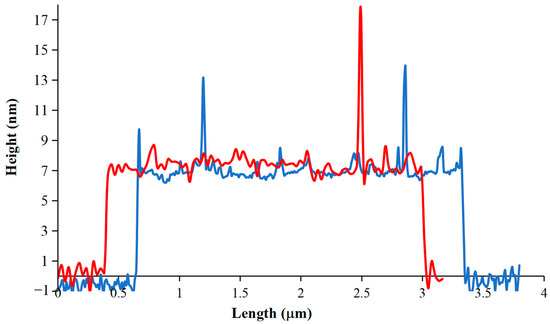 Although the wrinkles after annealing occurred under both 600 °C and 700 °C, their number and location changed. Two long wrinkles were observed under 700 °C, and only one long wrinkle appeared under 600 °C. The number of wrinkles grows along with the annealing temperature, suggesting that more compressive strain has been introduced. In order to verify our suspicions, the heights along the red dashed line in Figure 6d and along the blue dashed line in Figure 6e were measured, as shown in Figure 7. The wrinkle heights after annealing under 600 °C and 700 °C were approximately 6 nm and 10 nm relative to the flat sample surface. Although the winkles after annealing under 700 °C were lower than those that appeared under 600 °C, the strain corresponding to two wrinkles was greater than one wrinkle. Although there were less wrinkles at 700 °C than at 600 °C, there were more wrinkles to withstand the compressive stress at 700 °C.