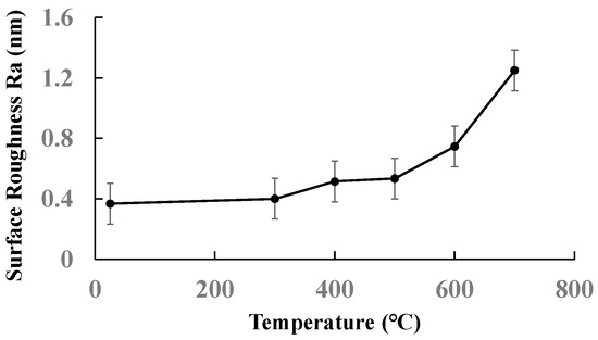 The surface roughness of the sample of 7 nm thickness can be obtained directly from the above AFM images (Figure 6), as shown in Figure 9. The roughness of ten lines in different areas of the h-BN flake was investigated after annealing at different temperatures. It can be seen from Figure 9 that the surface roughness of the sample is about 0.4 nm at room temperature and 300 °C. Before 500 °C, the roughness of the sample is kept in a narrow range of about 0.3–0.6 nm. However, when the annealing temperature reaches 600 °C, the surface roughness suddenly increases, and the roughness rises to 0.7 nm. Finally, when the temperature reaches 700 °C, the roughness is 1.2 ± 0.15 nm. This is consistent with the fact that wrinkles are observed in Figure 6. The roughness of the h-BN flake surface depends on the atomic lattice match between boron nitride and the silicon dioxide substrate. The higher the temperature, the more severe the lattice mismatch will be. The thin h-BN flakes are reported to have a negative in-plane thermal expansion coefficient compared to the positive thermal expansion coefficient of silicon oxide substrates. This means that h-BN flakes shrink at higher temperatures, which leads to more pronounced winkles and a higher surface roughness.