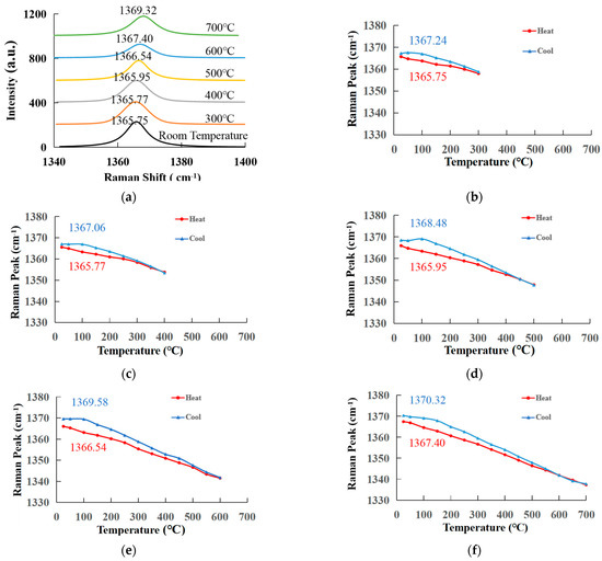 Ex situ and in situ Raman spectra: (a) Ex situ Raman spectra of the h-BN flake shown in Figure 2. Raman peak frequency shifts during heating/cooling cycle under the annealing temperatures of 300 °C (b), 400 °C (c), 500 °C (d), 600 °C (e) and 700 °C (f).