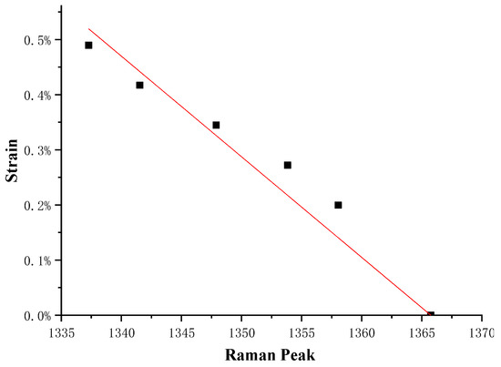 In order to obtain the relationship between the Raman peak frequency shift and the strain of the boron nitride, it is assumed here that there is no strain induced in the sample prepared process. The strain in the h-BN flake at temperature t is calculated as , where is the coefficient of thermal expansion of SiO2 [36] and is the coefficient of thermal expansion of the h-BN flake [37]. The Raman peaks at room temperature, 300 °C, 400 °C, 500 °C, 600 °C and 700 °C at the end of the heating process during each annealing experiment, respectively, were abstracted, as shown in Figure 11. These peaks were linearly fitted to the corresponding calculated strains to obtain the following expressions: . The compress strain in the h-BN flake was found to be 0.052% (300 °C), 0.048% (400 °C), 0.075% (500 °C), 0.095% (600 °C) and 0.108% (700 °C) after the annealing at each temperature.