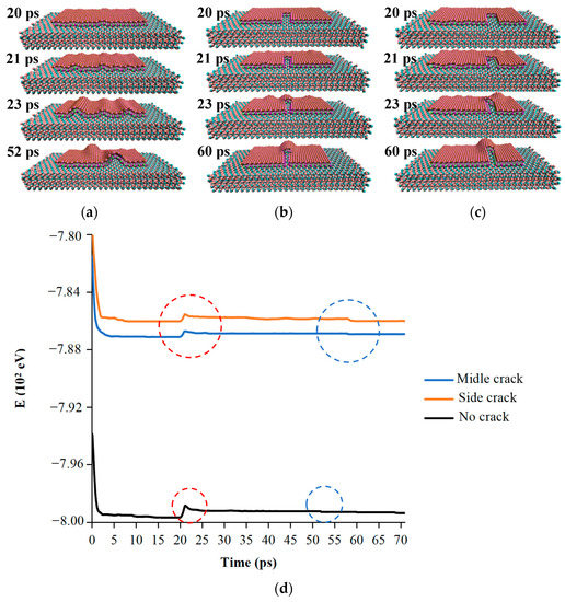 In order to explore the phenomenon of the crack effect, a molecular dynamics simulation was carried out. Figure 12a shows an intact h-BN flake model with no crack. The h-BN model in Figure 6b has a crack created in the middle against the bottom, and the model in Figure 6c has a crack created on the right against the bottom. It can be seen from the Raman spectrum that the wrinkles are caused by the compressive stress introduced after annealing. Therefore, the uniaxial compression of the model was directly carried out to explore the locations of wrinkles. Figure 12 shows the change of the h-BN model morphology with the simulation time. The 20 ps and 21 ps correspond to the end of the relaxation and axial compression, respectively. When the compression was over, the sample presented a number of small wrinkles, and with the continuation of the simulation, the wrinkles began to converge, tending to become large. At 52 ps, two wrinkle-like caves were formed, and the shape was stable with continued simulation. Unlike the intact boron nitride model, the notched sample formed a stable wrinkle at the crack at 60 ps. The variations of energy with time in the simulation process of the three models are shown in Figure 12d. It could be seen from the images after relaxation that the system energy increased when the system model was compressed at 21 ps (red circle), and after the compression, the energy began to decrease and reached the minimum at about 52 ps (blue circle in the intact model) and 60 ps (blue circle in the cracked model). The system energy no longer changed after the formation of the above shaped wrinkles, which also indicated that the wrinkles at the crack were the most stable. Therefore, a wrinkle was easy to appear stable at the crack.