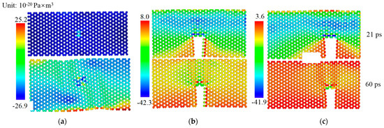 Finally, the stress change of the bottom layer of the h-BN flake model with time is investigated, as shown in Figure 13. For ease of observation, the substrate and the top layer h-BN flake are hidden. When the system is at 21 ps—that is, after the end of compression—the compressive stress is mainly concentrated on the top of the crack region, and the stress on both sides of the crack is lower. Since there are no atoms at the crack, the atoms on either side of the crack are less compressed, resulting in lower stress. The stress is uniformly distributed in the intact model. The maximum compressive stress is 42.3 × 10−20 Pa × m3 for the model with a crack in the middle region and 41.9 × 10−20 Pa × m3 for the model with a crack in the side region. The maximum compressive stress is 26.9 × 10−20 Pa × m3 for the intact model, which is significantly less than the stress with a crack. This is because the stress distribution is more uniform in the intact model, while defective areas tend to cause stress concentration. With the change of time, the compressive stress begins to release gradually through the formation of wrinkles. The maximum compressive stress values are 19.1 × 10−20 (intact model), 11.0 × 10−20 Pa × m3 (middle crack) and 19.9 × 10−20 Pa × m3 (side crack). There is no significant reduction in stress of the intact model at 60 ps compared with that at 21 ps. It can be seen from Figure 13a that the intact model forms two wrinkle-like caves under compressive stress, and stress concentrates at the closed end of the wrinkle. The maximum compressive stress in the crack models is located at the crack. This is all due to the stress concentration effect.
