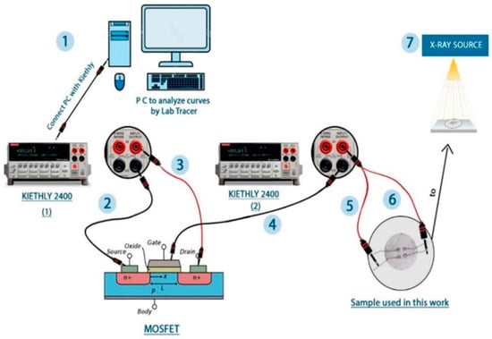where is the fractional contents of the electrons belonging to different elements of atomic number Z1, Z2… etc., within the compound/mixture forming the medium. Z represents the atomic number of each element contained within the medium. For photon practical purposes, the value adopted is typically 2.94 []. The fingerprint-interdigitated silver electrodes were deposited on the thin film and disk, and the wires were connected using the silver paste. The samples were then connected as EG to the MOSFET to obtain the I-V characterization under different doses; low dose (9, 36, and 70 mGy) using an X-ray tube in the school of physics, USM, and high dose (1, 5 and 10 Gy) using a linear accelerator (LINAC) radiotherapy machine (Elekta) located at Gleneagles Hospital, Penang, Malaysia. To keep the device (FET) from being exposed to radiation, the MOSFET is connected to the semiconductor film through the extended gate. The Ids–Vds and Ids–Vgs curves for saturation and linear regimes were measured using the EGFET connection setup system depicted in Figure 2. It consists of two Keithley instruments; one was used to set the gate-source voltage (Vgs) at bias voltage 3 V and measure the drain-source current (Ids) response versus drain-source voltage (Vds) under different irradiation doses (9, 36, and 70 mGy and 1, 5, and 10), this measurement gives saturation regime. On the other hand, the second Keithley instrument was used to set (Vds) at bias voltage 0.3 V and measure (Ids) response versus gate-source voltage (Vgs). The output curves formed the linear regime. Two measurement conditions were conducted for the control samples (thin films and disks without radiation) under low and high irradiation, as displayed in Figure 3. The threshold voltage (VTH), which was determined using the relation in Equation (3) was used to characterize the film’s sensitivity: